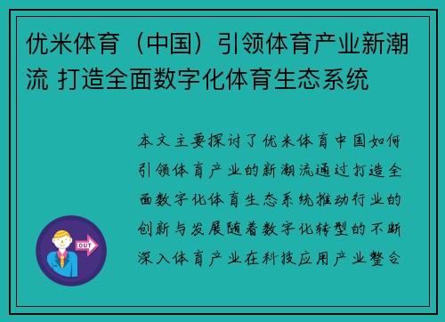 本文主要探讨了优米体育(中国)如何引领体育产业的新潮流,通过打造全面数字化体育生态系统,推动行业的创新与发展。随着数字化转型的不断深入,体育产业在科技应用、产业整合、智能化管理、以及用户体验等方面逐渐迎来新的突破。优米体育(中国)凭借其独特的战略视角,紧抓体育产业的数字化趋势,整合线上线下资源,推动行业深度变革。文章将从四个方面详细阐述优米体育(中国)如何引领体育产业新潮流,并为未来的行业发展带来深远的影响。
