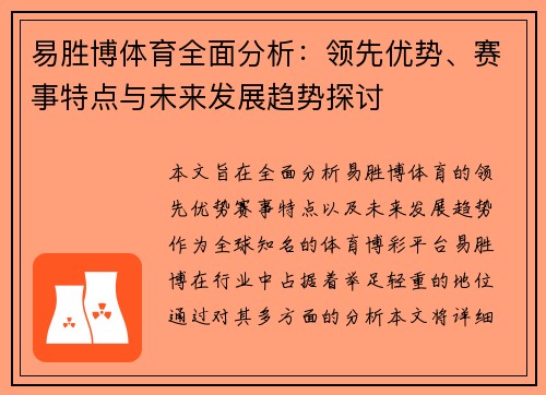 本文旨在全面分析易胜博体育的领先优势、赛事特点以及未来发展趋势。作为全球知名的体育博彩平台,易胜博在行业中占据着举足轻重的地位。通过对其多方面的分析,本文将详细探讨易胜博如何在市场竞争中脱颖而出,其赛事特点如何吸引全球用户的关注,并对其未来可能的发展趋势进行预测。具体内容包括易胜博体育的领先优势,赛事特点的独特之处,未来发展面临的挑战与机遇,以及在市场环境中的竞争策略。通过这些分析,本文力图为读者呈现出易胜博体育在全球体育博彩领域的独特魅力及其未来发展潜力。