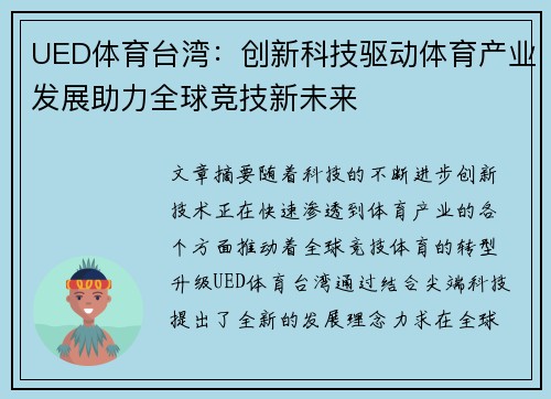 随着科技的不断进步,创新技术正在快速渗透到体育产业的各个方面,推动着全球竞技体育的转型升级。UED体育台湾通过结合尖端科技,提出了全新的发展理念,力求在全球体育产业中占据一席之地。本文将从四个关键方面详细探讨UED体育台湾如何通过创新科技推动体育产业的发展,并助力全球竞技体育迈向全新未来。这四个方面包括:科技赋能体育训练与赛事表现、数字化平台与粉丝互动、智能硬件与装备创新、体育数据分析与决策支持。每个方面都将在实际应用中展现其潜力和价值,并共同促进全球体育产业的繁荣与发展。通过对这些领域的详细分析,本文旨在全面展示UED体育台湾如何利用创新科技为全球体育竞技带来新的动力与机遇。